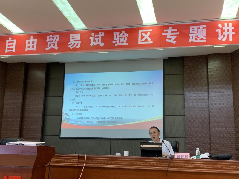 講座特邀省商務廳原二級巡視員、省商業經濟學會會長戴傳裕蒞臨授課。戴傳裕以《高標準高質量推進安徽自貿區建設》為題,從自貿試驗區是什么、自貿試驗區怎么樣、安徽自貿試驗區怎么干等三個方面,對安徽自由貿易試驗區建設的總體情況進行了全面介紹,對區域內優化營商環境、金融領域開放創新、深化科技開放合作等系列政策作了深入解讀。
