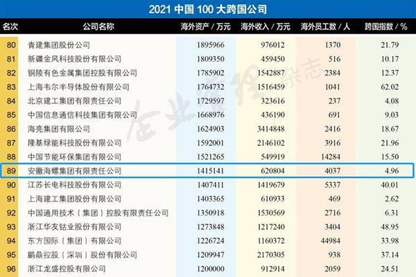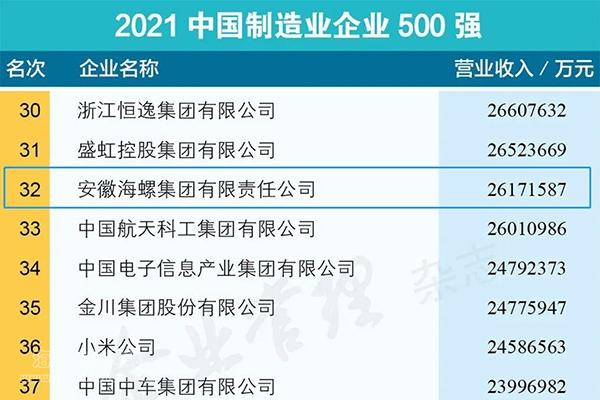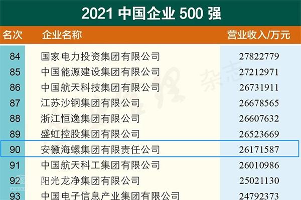 2021年9月24日—25日,2021中國企業(yè)500強(qiáng)高峰論壇在吉林長春舉行,向社會(huì)發(fā)布了“中國企業(yè)500強(qiáng)”榜單。海螺集團(tuán)連續(xù)17年入圍中國企業(yè)500強(qiáng),榮列2021中國企業(yè)500強(qiáng)第90位,較2020年上升了2位;同時(shí),榮列2021中國制造業(yè)企業(yè)500強(qiáng)第32位;榮列2021中國跨國公司100大第89位,比2020年上升7位;首次登上中國2021大企業(yè)創(chuàng)新100強(qiáng)榜單,名列第89位。