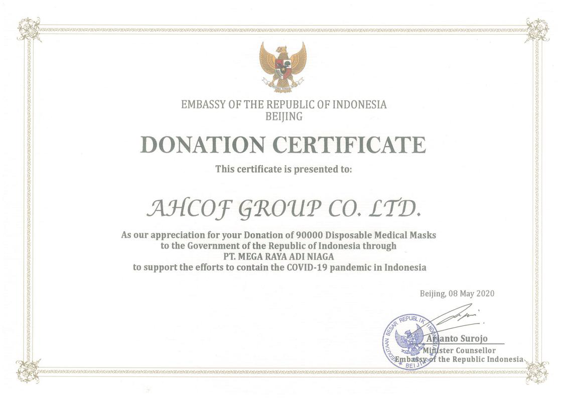近日,印尼駐華大使館向安糧集團(tuán)發(fā)來捐贈證明書,以表達(dá)對安糧集團(tuán)捐贈印尼政府9萬只口罩之舉的誠摯感謝。