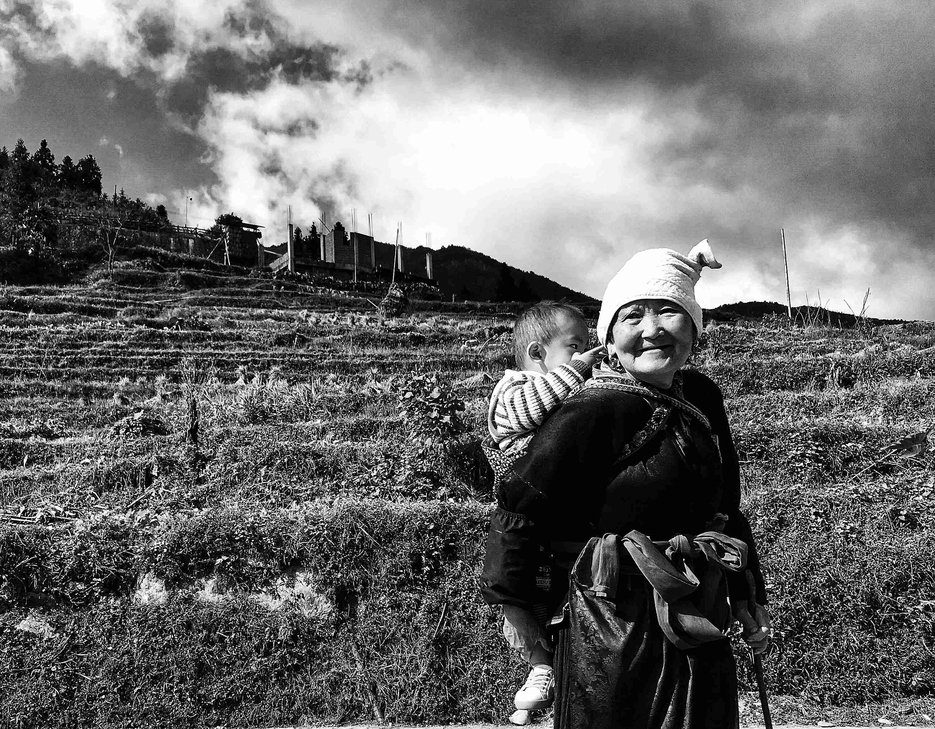 圖中這位阿婆身背父母在外地打工的孫子,看到我們在拍照游玩,走上前來與我們聊天,臉上洋溢著幸福的笑容。