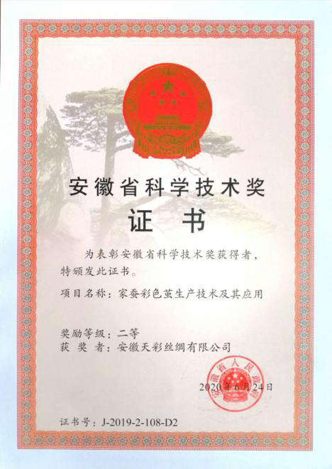 安徽省科學技術獎是安徽省人民政府對為我省科學技術進步、經濟社會發展作出突出貢獻的科學技術人員和組織給予的獎勵。此次,天彩絲綢公司參與研究的“家蠶彩色繭生產技術及其應用”項目,榮獲省科學技術進步獎二等獎,這也是天彩絲綢公司自成立以來所獲的最高級別科技獎項。